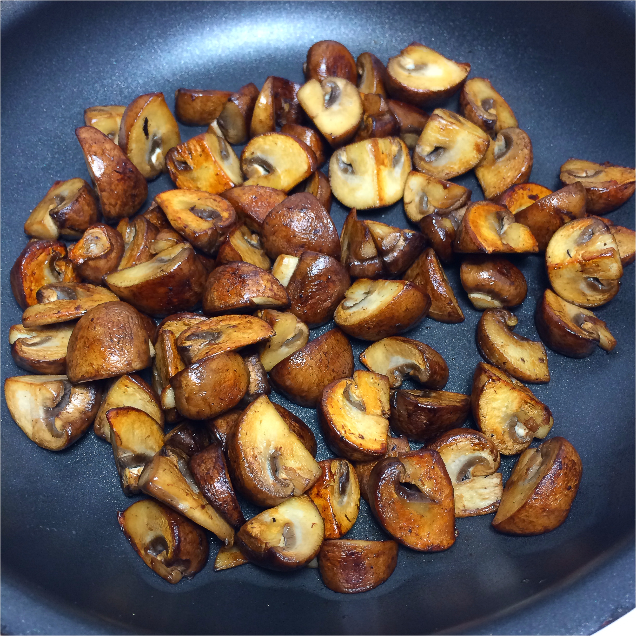 6. Heat canola oil in a small saute pan and saute mushroom quarters for 8 minutes or until all the liquid has been released.